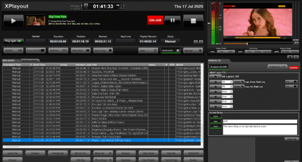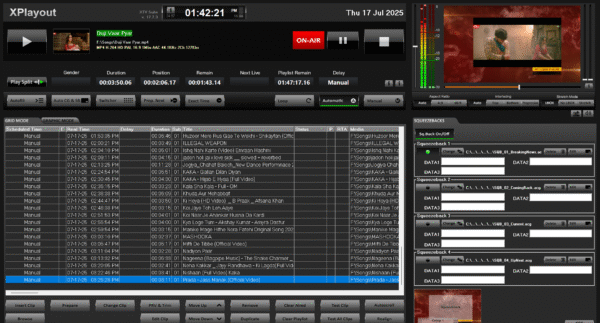 Les données EAS critiques, telles que les messages texte à l’écran reçus via le port série et le flux audio, sont décodées par XPlayout. L’alerte texte à l’écran est ensuite générée et le flux audio correspondant est diffusé à l’antenne via la sortie SDI (sur BMD Decklink uniquement), réduisant ainsi le niveau audio du programme en cours pour garantir la reconnaissance des messages d’urgence.