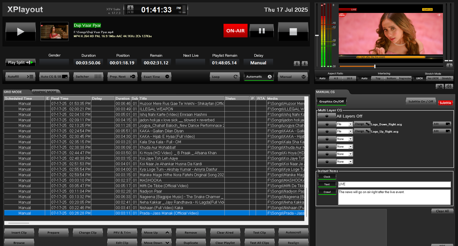 XTV Suite est un logiciel professionnel d’automatisation de diffusion TV qui gère la diffusion vidéo, la capture, le découpage, la programmation et les images de synthèse. Offrant une efficacité automatique et sans surveillance 24h/24 et 7j/7, XTV est l’outil idéal pour les chaînes de télévision, les chaînes satellite, la télévision par câble, les salles de presse, la web TV et la vidéosurveillance. Les chaînes d’entreprise, les chaînes payantes des hôtels, les chaînes d’information des musées et les murs d’images peuvent également l’utiliser et profiter de son interface conviviale. L’architecture XTV Channel In A Box (CIAB) garantit une évolutivité linéaire de votre installation de diffusion TV.